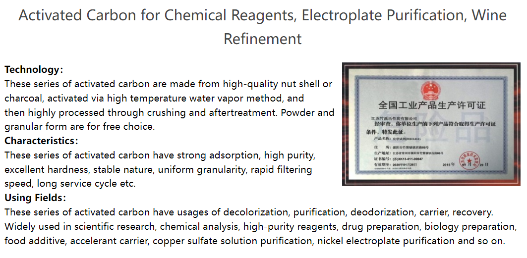 Activated Carbon for Chemical Reagents, Electroplate Purification, Wine Refinement