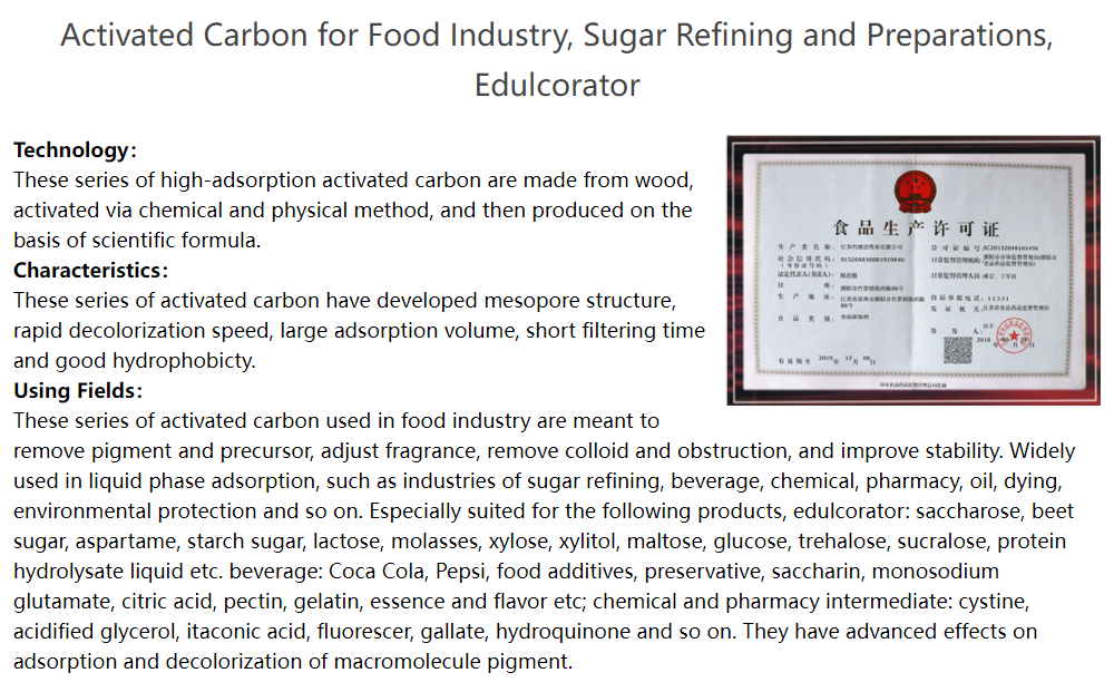 Activated Carbon for Food Industry, Sugar Refining and Preparations, Edulcorator