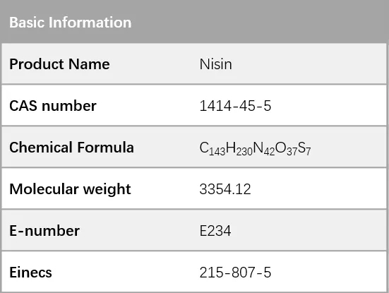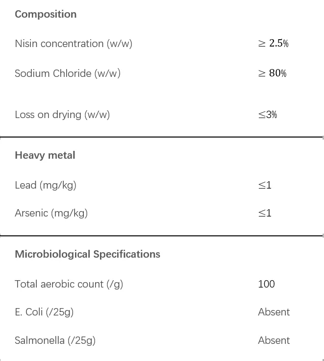 Nisin can effectivelyinhibits or inactive the pathogenic microorganisms such asListeria, Staphylococcus,and Mycobacterium, as well as the spores produced by heat-resistant bacteriasuch asBacillusandClostridium.Therefore, the use of Nisincould reduce food sterilization temperature and shorten sterilization time, improvingfood quality and reducing damage to nutrition and taste.