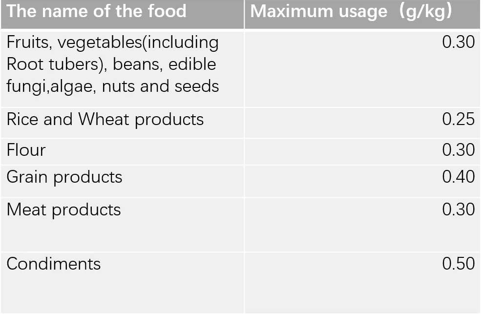 In China, according to the 《Hygienic standard for the use of food additives》 GB2760. The usage amount and the scope of use are as follows: