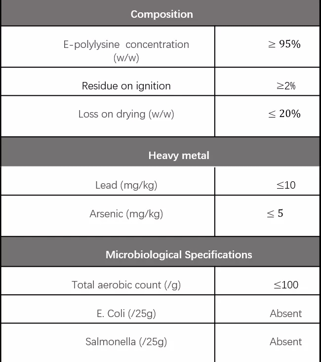 ε-Polylysine is known for its safety , effectiveness and natual origin in food industry to prolong the shelf-life and retain food quality. It is derived from the fermentation of streptolyces and composed of 25 to 30 lysine residues. After consumption, it can be digested by the body to become the molecules of lysine - the amino acid required by the body without any side effects. Also unlike other natural bioperservertives, εPolylysinehas a wide antimicrobial spectrum against both gram positive bacteria and gram negative bacteria. It has inhibitory effects on yeast and molds in acidic and slightly acidic environments.