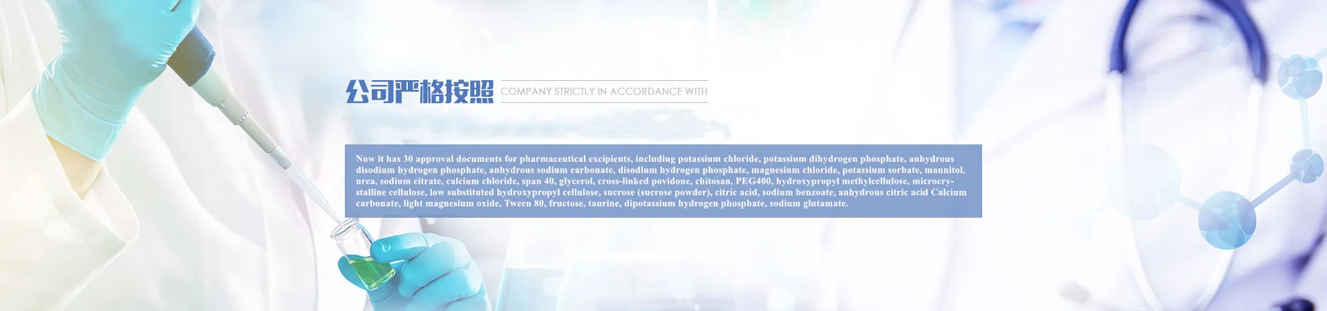 The company carries out production in strict accordance with the production quality management specification for pharmaceutical excipients. Now it has 30 approval documents for pharmaceutical excipients, including potassium chloride, potassium dihydrogen phosphate, anhydrous disodium hydrogen phosphate, anhydrous sodium carbonate, disodium hydrogen phosphate, magnesium chloride, potassium sorbate, mannitol, urea, sodium citrate, calcium chloride, span 40, glycerol, cross-linked povidone, chitosan, PEG400, hydroxypropyl methylcellulose, microcrystalline cellulose, low substituted hydroxypropyl cellulose, sucrose (sucrose powder), citric acid, sodium benzoate, anhydrous citric acid Calcium carbonate, light magnesium oxide, Tween 80, fructose, taurine, dipotassium hydrogen phosphate, sodium glutamate.