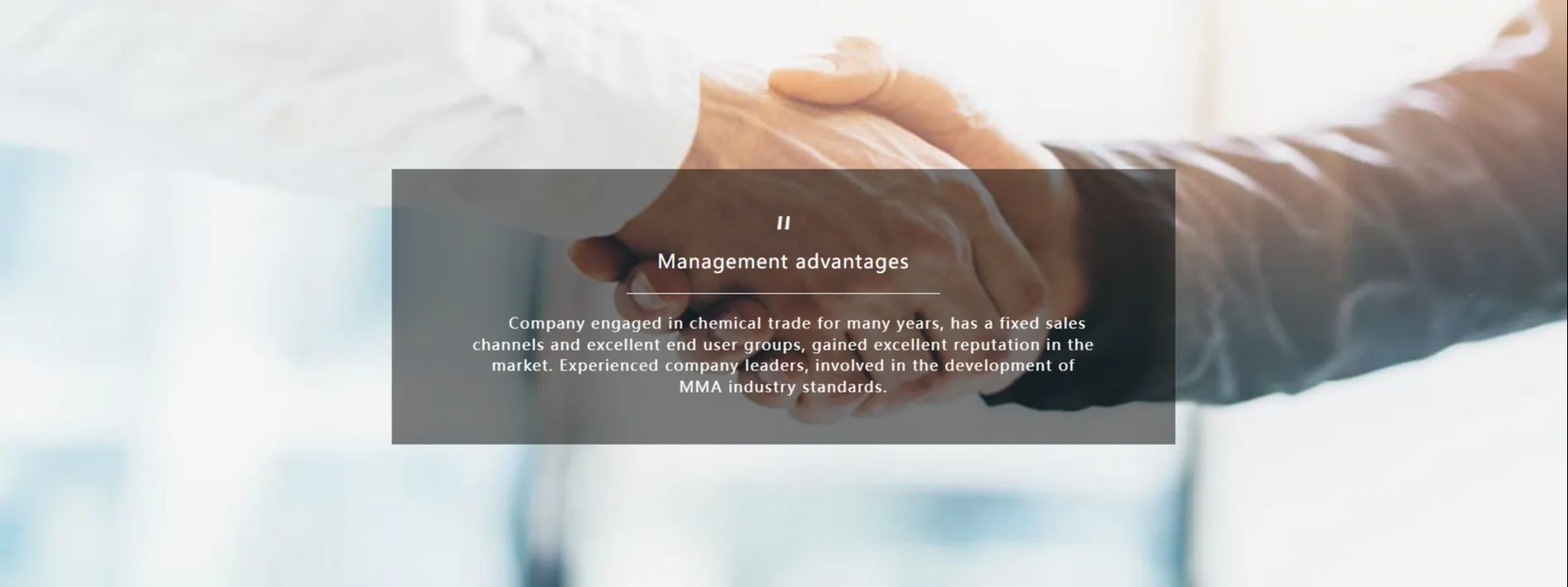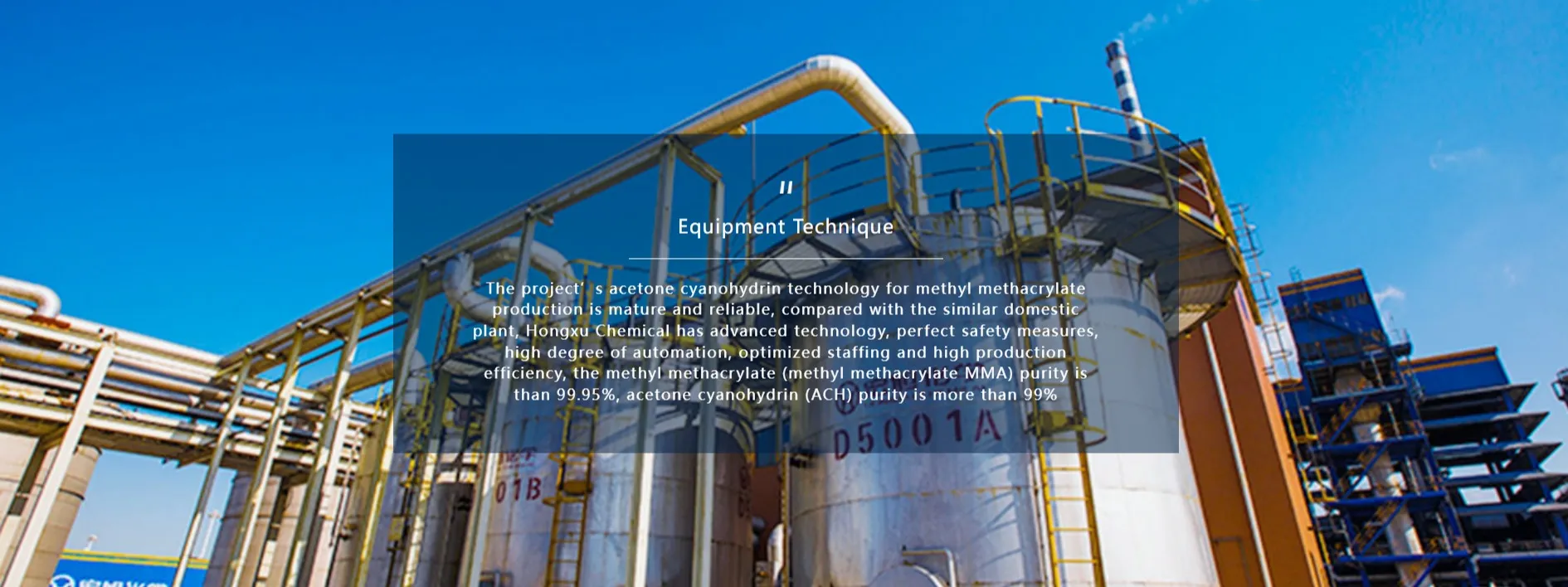 In order to further extend the industrial chain, create new profit growth points and speed up the implementation of the development strategy of chemical rubber integration, China Wanda Group established a wholly-owned subsidiary“Shandong Hongxu Chemical Co., Ltd.”. The company is located West of Gangxi 1 road, North of Gangbei 1 road of Dongying Port Economic Development Zone, Dongying City, Shandong Province, which is adjacent to Dongying Port Terminal, and the Donggang Expressway runs through the hinterland, convenient water and land transportation facilities provides a geographical location advantageous. The company built 90,000 tons/year of Methyl Methacrylate (MMA) production and raw materials supporting projects, which is one of the fine chemical industry projects belonging to China Wanda group, it has a vast development of space and good market prospects.