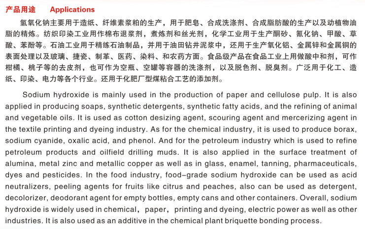 It is used to make special soap, insecticide, hard water softening, beet sugar refining, boiler descaling, glass lubrication, etc. it is also used to prepare organic synthesis and barium salt; In chemical experiments, in addition to being used as a reagent, it can also be used as an alkaline desiccant because of its strong hygroscopicity. The sectors that use caustic soda most are chemical manufacturing, followed by papermaking, aluminum smelting, tungsten smelting, rayon, artificial cotton and soap manufacturing. In addition, in the production of dyes, plastics, chemicals and organic intermediates, the regeneration of old rubber, the electrolysis of metal sodium and water, and the production of inorganic salts, a large amount of caustic soda is also used in the production of borax, chromate, manganate, phosphate, etc.