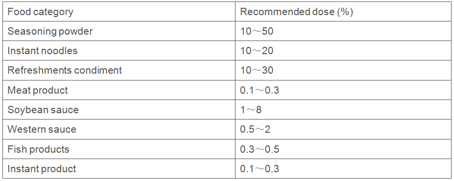 such as: dosage in vegetable: 0.15-0.2%; dosage in fish and meat: 0.17%—0.25%; dosage in soup: 0.1%—0.2%;
