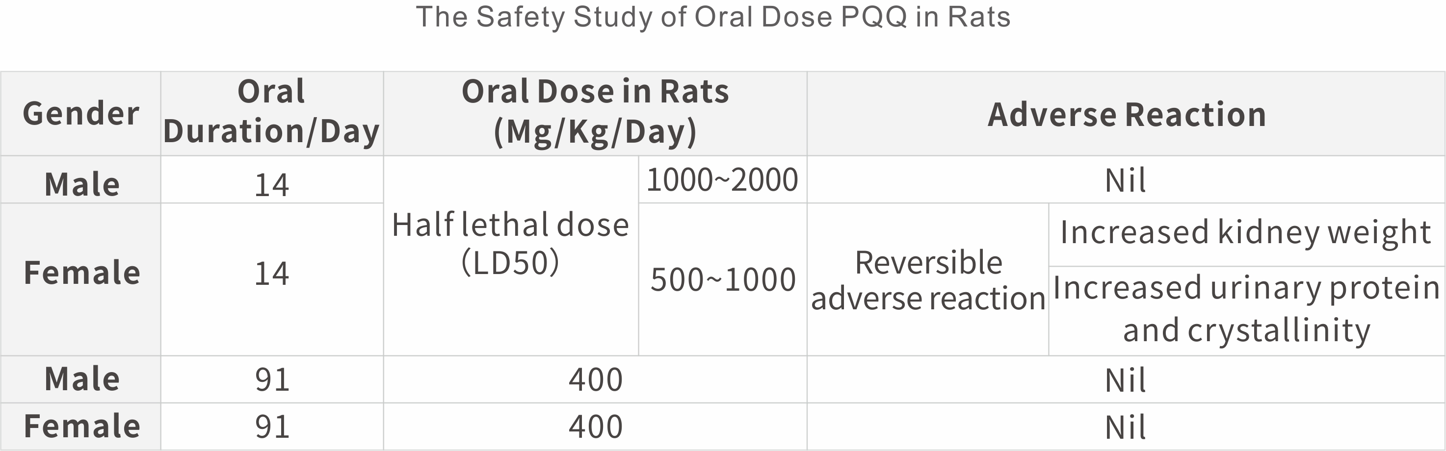 In the human-controlled double-blind clinical trial, volunteers took PQQ at 60 mg/day for one month, and there were no adverse reactions and no changes in renal injury markers. The safe dose of FDA is: healthy about 60kg treated with a dose of 240mg PQQ every day, and there are few adverse events.