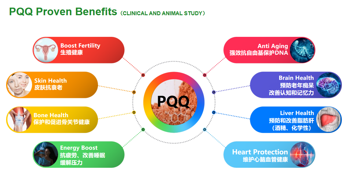 PQQ can eliminate reactive oxygen species (ROS) produced by hypoxia reperfusion and significantly reduce the release of lactate dehydrogenase in the heart. Under the catalysis of flavin mononucleotide reductase, its catalytic product can also reduce the peroxidation state of hemoglobin and eliminate the damage of myocardial ischemia reperfusion.