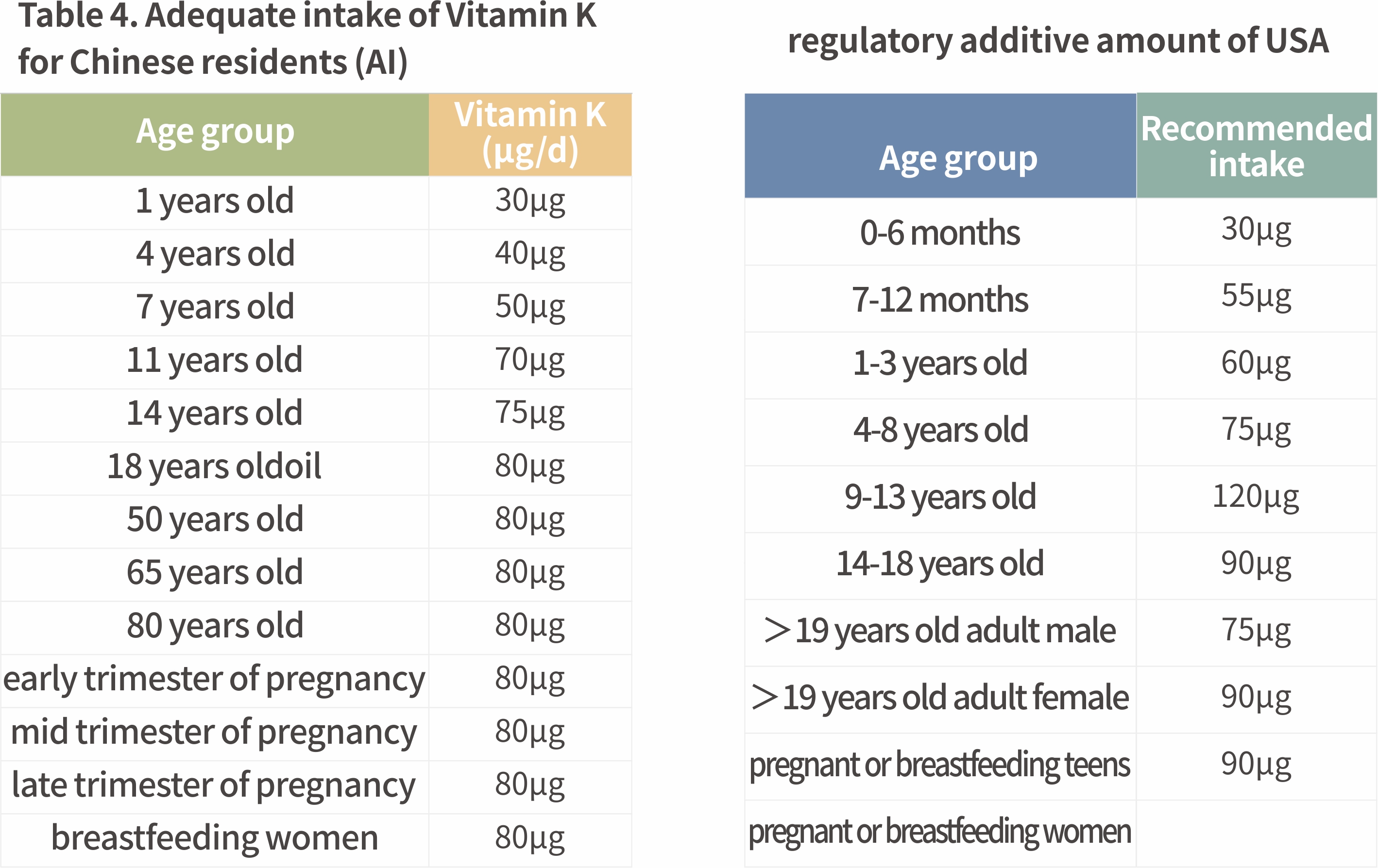 The daily adequate intake (AI) of vitamin K in the Dietary Guidelines for Chinese Residents 2016 is shown in Table 4 below:
