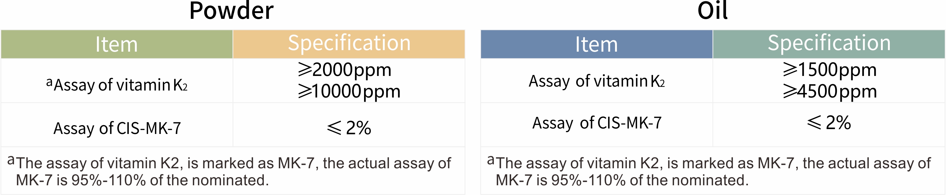 Grade Standard: | Food Grade | Assay VK2-7: | Powder: ≥2000ppm, ≥10000ppm; Oil: ≥1500ppm, ≥4500ppm |