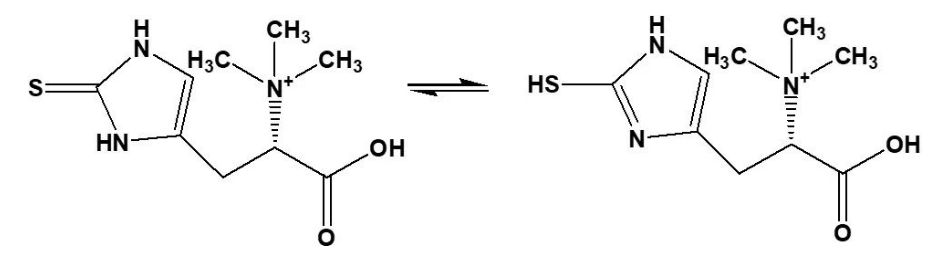 In the dissolved state, l-ergothioneine exists in the form of tautomer between its two structures, thione and thiol; while at physiological pH, l-ergothioneine mainly exists in the form of thione, so it will only react with some sulfhydryl reagents. Additionally, the standard redox potential of thiol-disulfides is 0.06 volts, while the redox potentials of other natural thiols are typically between 0.2 and 0.32 volts. Taken together, these two unique properties confer greater stability to l-ergothioneine under physiological conditions, making it less prone to auto-oxidative reactions than other antioxidant thiols such as glutathione.