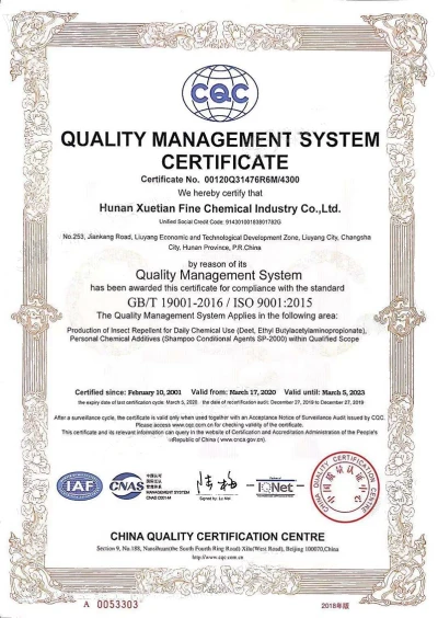 Hunan Xuetian Fine Chemical Industry Co., Ltd. is a designated manufacturer of mosquito repellent and preparations. It obtains both pesticide registration certificate and the production license in deet, insect repellent-baape and mosquito repellent spray liquid. The main products of our company include: Deet, insect repellent-BAAPE, mosquito repellent preparation, L-menthyl lactate, amino acid surfactant, salt anti-coagulant, industrial adjuvants, etc. The company has passed the ISO9001 quality system certification of the latest standards.
