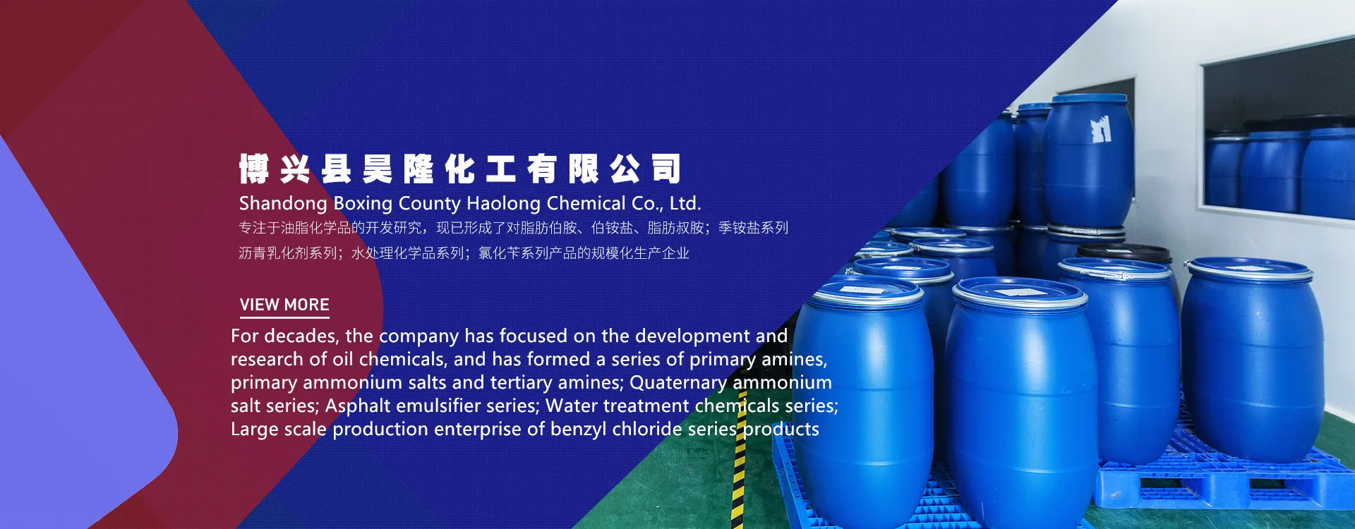 Shandong Boxing County Haolong Chemical Co., Ltd. is a production-oriented enterprise integrating the development, production and sales of oil chemicals. For decades, the company has been focusing on the development and research of oil chemicals, and has formed a process for fatty primary amine, primary ammonium salt and fatty tertiary amine; Quaternary ammonium salt series; Asphalt emulsifier series; Water treatment chemicals series; Large scale production enterprise of benzyl chloride series products; The company's tenet is "building a business in good faith, building people in good faith, buying our products and providing home service".