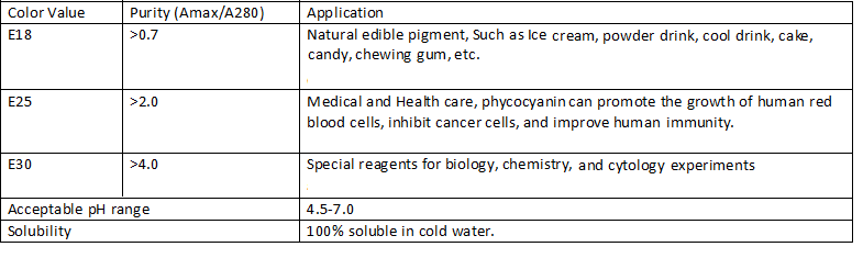 The algae species of Spirulina are specially selected,keep the water source clean and to monitor it in real time during the breeding process. If there are abnormalities and timely processing. Strengthen the quality control,QC test for each batch of phycocyanin,and then arrange for storage after passing the test.