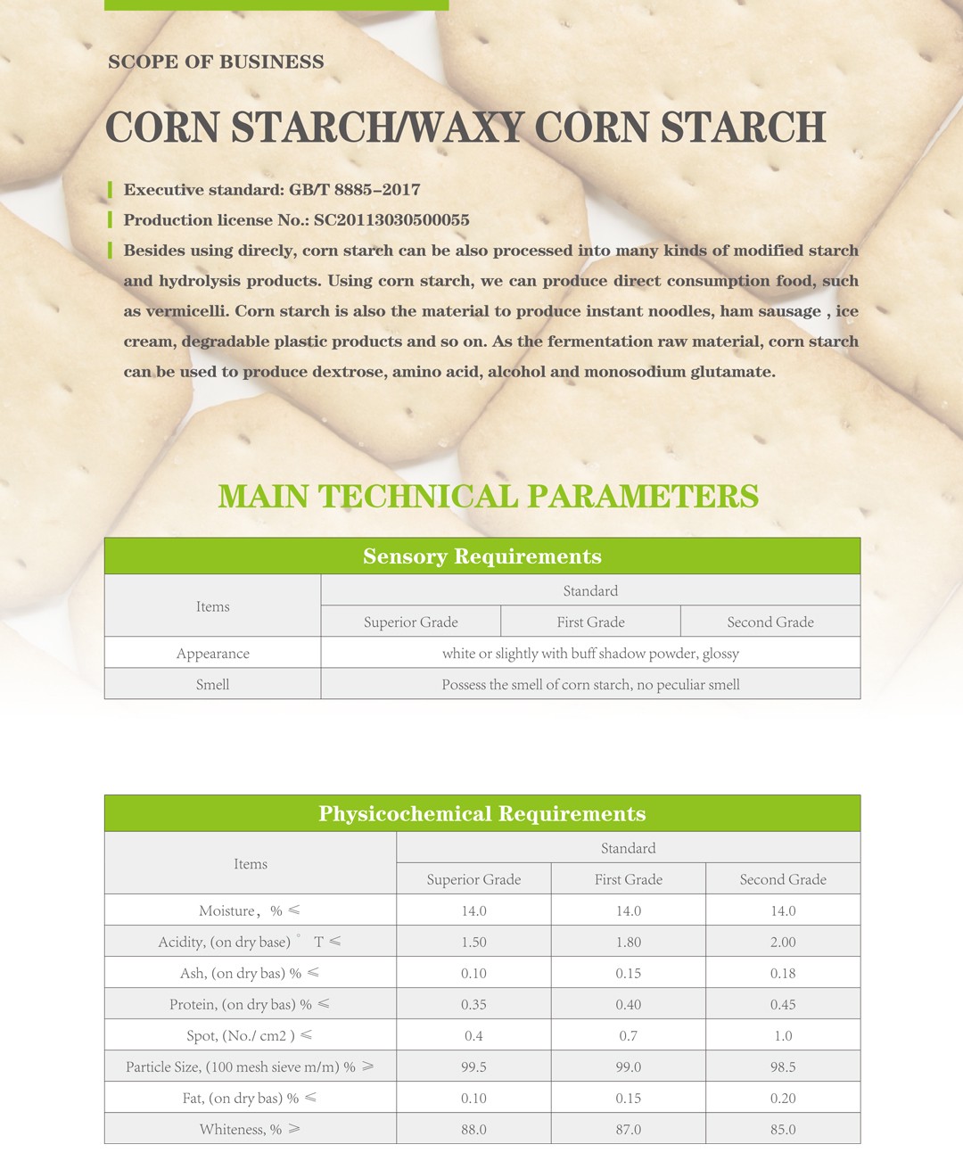 Starch is white and light yellow powder. The grain is soaked in 0.3% sulphurous acid and then crushed, sieved, precipitated, dried and ground. Ordinary products contain a small amount of fat and protein, strong moisture absorption, up to 30%. Starch sugar industry uses starch to produce high maltose syrup, fructose syrup, maltodextrin, etc. Starch is used in modified starch industry, and its modified starch is widely used in papermaking, chemical industry and other industries. Starch is used in fermentation industry to produce monosodium glutamate, citric acid and many other products. Starch is also widely used in metallurgy, casting and other industries.