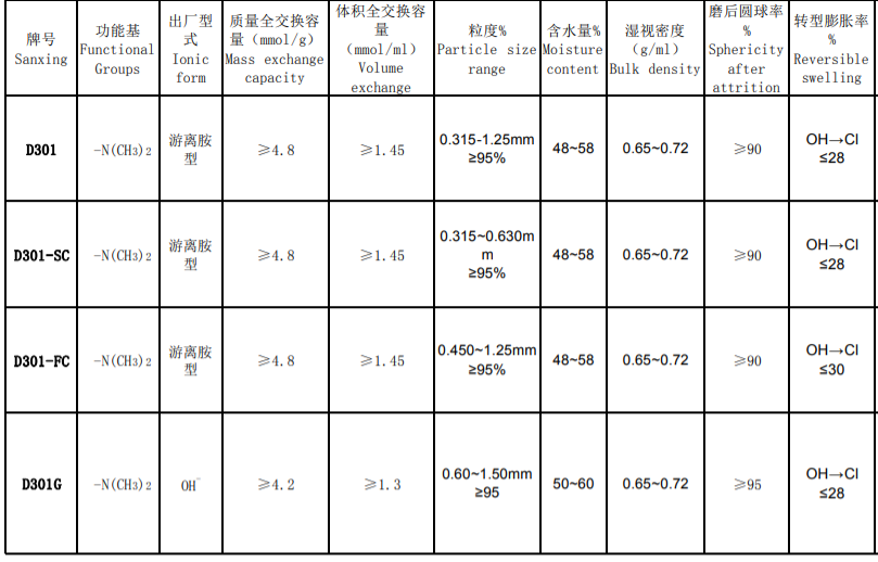 Macroporous D301 functional base: - n (CH3) 2 ex factory form: free amine type particle size: ≥ 95% water content: 48.0 ~ 58.0