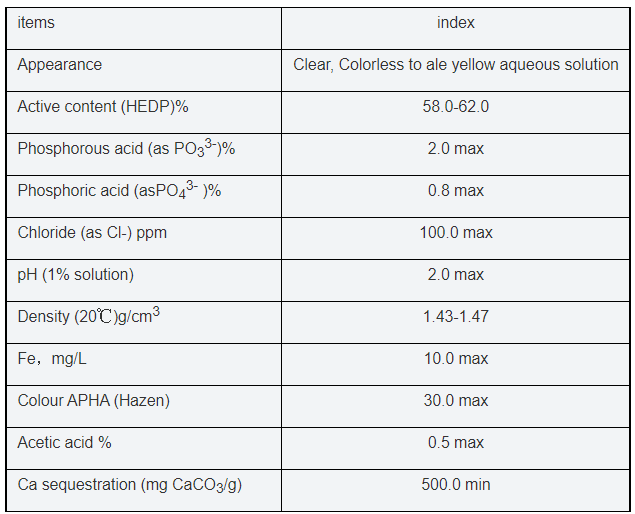 Pure etidronic acid is white crystal, industrial etidronic acid is colorless to light yellow transparent liquid, soluble in water, methanol and ethanol. Hydroxyethylidene diphosphonic acid is a kind of chemical raw material, which is often used in industrial water treatment, household cleaning products and personal care products. This product is the main material of cyanide free electroplating. It is used to prepare cyanide free copper electroplating solution. The copper coating directly plated on sodium iron has good adhesion, smooth coating and good color. In addition, hydroxyethylidene diphosphonic acid is often used as scale and corrosion inhibitor in boiler water, circulating water and oilfield water injection treatment. It is generally combined with polyhydroxy acid scale inhibitor and dispersant, and can also be used as color fixing agent and hydrogen peroxide stabilizer in bleaching and dyeing industry.