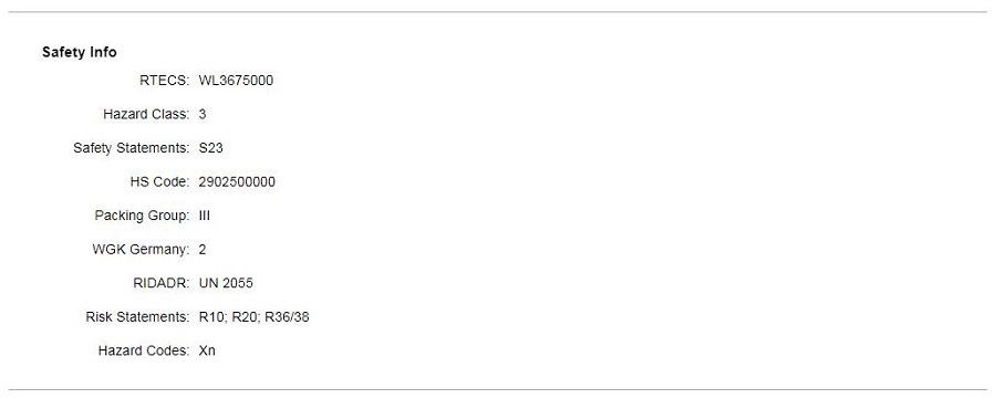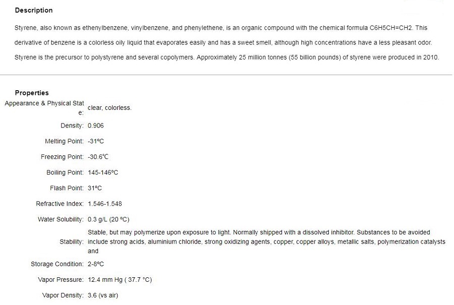 The most important uses are the synthetic rubber and plastic monomers for the production of styrene butadiene rubber, polystyrene and foam polystyrene. It is also used for copolymerization with other monomers to produce engineering plastics for a variety of different purposes. For example, ABS resin is prepared by copolymerization with acrylonitrile and butadiene, which is widely used in various household appliances and industry; The San prepared by copolymerization with acrylonitrile is an impact resistant resin with bright color; SBS prepared by copolymerization with butadiene is a thermoplastic rubber, which is widely used as modifier of PVC and polypropylene. In addition, a small amount of styrene is also used as intermediates such as spices. Cinnamyl chloride is obtained by chloromethylation of styrene. It is used as an intermediate of qiantongding, a non narcotic analgesic. Styrene is also used as an easy cough zine for antitussive and expectorant and as an original drug of Weichangning, an anticholinergic drug. It can also be used as a hard monomer for producing styrene acrylic emulsion and solvent type pressure sensitive adhesive, or for cross-linking monomer of unsaturated polyester resin. It is used for organic synthesis and resin synthesis, and for preparing copper plating brightener, which plays the role of leveling and brightening. It is used as a hard monomer for the production of styrene acrylic emulsion and solvent type pressure sensitive adhesive, and it can also be used as cross-linking monomer of unsaturated polyester resin. It is used to make polystyrene, foam polystyrene and styrene butadiene rubber. ABS resin was prepared by copolymerization with acrylonitrile and butadiene; SBS and SIS thermoplastic elastomers were prepared by copolymerization with butadiene and isoprene respectively; Emulsion adhesives and coatings were prepared by copolymerization with vinyl acetate and acrylic ester. It is also used as crosslinking monomer of unsaturated polyester, modification of PVC and polypropylene, and intermediate of synthetic perfume. Cinnamyl chloride is obtained by chloromethylation of styrene. It is used as an intermediate of qiantongding, a non narcotic analgesic. Styrene is also used as the original drug of yikezine, an antitussive and expectorant drug, and Weichangning, an anticholinergic drug. It is used to synthesize styrene butadiene rubber and polystyrene resin, polyester FRP and coatings, synthetic dye intermediate anthraquinone, pesticide emulsifier, medicine, beneficiation agent styrene phosphonic acid, etc. Used for making polystyrene, synthetic rubber, ion exchange resin, etc.