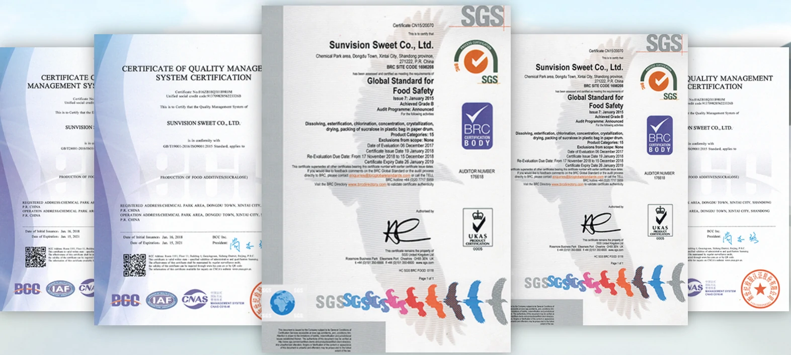 The quality of Sunvision Sweet products is in full compliance with standards including FCCVII, USP34-NF29, EC231/2012(2008/60/EC), EP2368, GB25531, and Japanese Standards. Sunvision Sweet has also been approved as a qualified supplier by various multinational food and beverage giants.