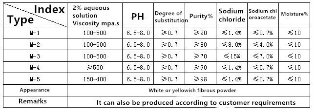 Loss on drying% ≤ 10.0, Chloride (ci-%) ≤ 1.2, PH value 6.0-8.5, Pb ≤ 0.0005, Heavy metals (calculated by Pb)% ≤ 0.0015, Iron (Fe)% ≤ 0.02, Arsenic (AS)% ≤ 0.0002; Degree of substitution (D.S) 0.65-0.90, Purity% ≥ 99.5, PH value 6.0-8.5, Loss on drying% ≤ 10.0