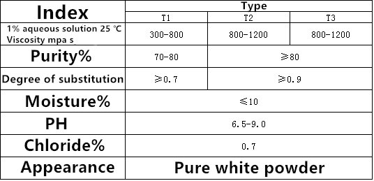 Loss on drying% ≤ 10.0, Chloride (ci-%) ≤ 1.2, PH value 6.0-8.5, Pb ≤ 0.0005, Heavy metals (calculated by Pb)% ≤ 0.0015, Iron (Fe)% ≤ 0.02, Arsenic (AS)% ≤ 0.0002; Degree of substitution (D.S) 0.65-0.90, Purity% ≥ 99.5, PH value 6.0-8.5, Loss on drying% ≤ 10.0