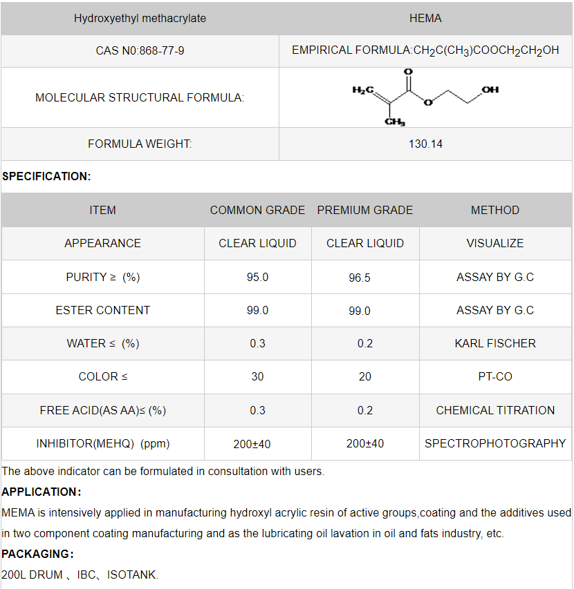 Hydroxyethyl methacrylate is a colorless, transparent and flowable liquid, soluble in common organic solvents. Hydroxyethyl methacrylate is mainly used to modify resins and coatings. Acrylic resin with active hydroxyl group in side chain can be prepared by copolymerization with other acrylic monomers. It can be used for esterification and cross-linking reaction to synthesize insoluble resin and improve adhesion. It can be used as fiber treatment agent. It can react with melamine formaldehyde (or urea formaldehyde) resin and epoxy resin to produce two-component coatings. It can keep the mirror luster for a long time by adding it into the paint of high-grade car. It can also be used as adhesive for synthetic textiles and medical polymer monomer.