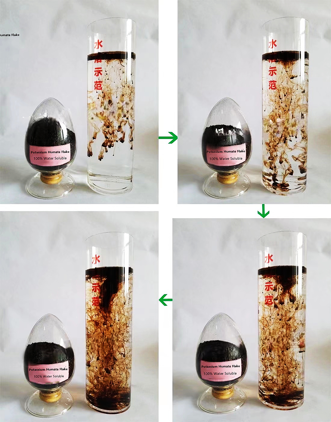 Potassium humate is easily soluble in water. Potassium Humate has the features of anti-hard water, deflocculation, no precipitation, etc. Humic acid potassium has a feature of wonderful water solubility in a wide span of PH values including the slightly acid conditions, the low molecular weight carrying the carboxyl functional group of higher activity strengthens the chelation of products which makes an easier absorption of mineral nutrients by plants.