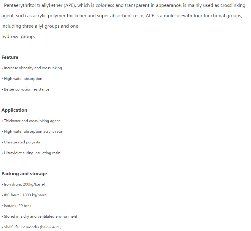 Pentaerythritol Triallyl ether (APE) is a colorless and transparent liquid. It is mainly used as crosslinking agent, such as acrylic polymer thickener and super absorbent resin. Ape is a molecule containing four functional groups, including three allyl groups and one hydroxyl group.