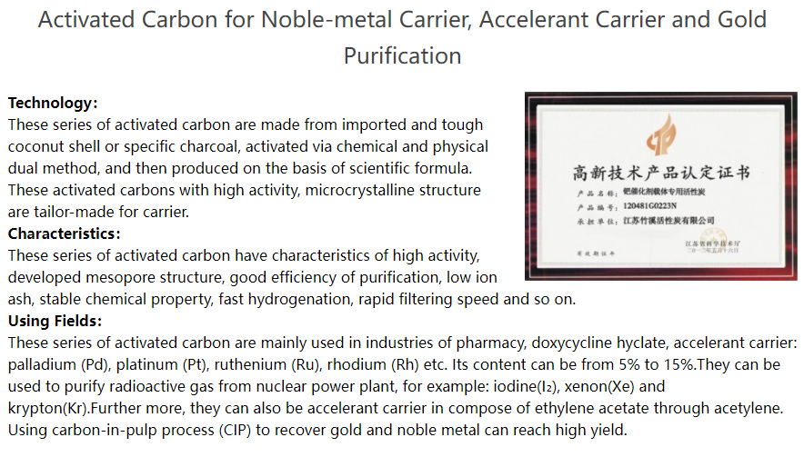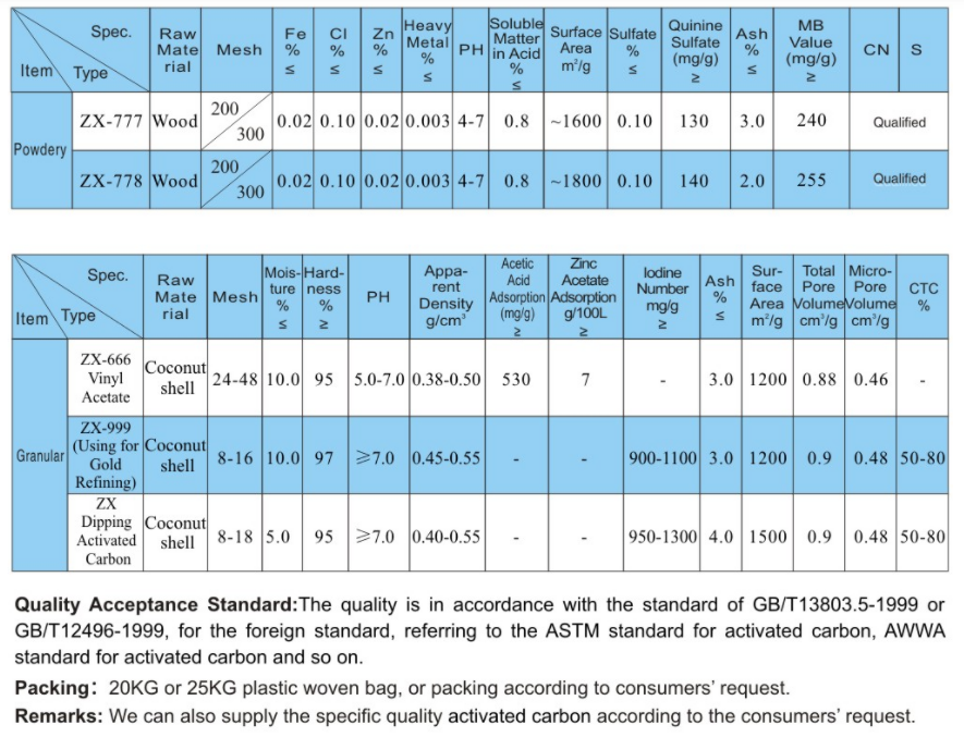ZX-777 particle size 200, 300 mesh ph4-7 ash ≤ 3% methylene blue adsorption value ≥ 240mg / g; ZX-778 particle size 200, 300 mesh ph4-7 ash ≤ 2% methylene blue adsorption value ≥ 255 mg / g; Zx-666 vinyl acetate synthesis particle size 24-48 mesh moisture ≤ 10% ph5-7 ash ≤ 3%; ZX-6999 (yellow carbon) particle size 8-16 mesh, moisture ≤ 10%, pH ≥ 7, ash ≤ 3%; ZX impregnated carbon particle size 8-18 mesh moisture ≤ 10% pH ≥ 7 ash ≤ 4%