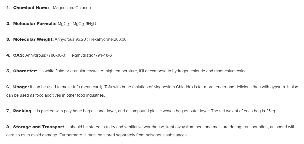 In the metallurgical industry, it is used as a binder for refractory and furnace wall, and as a raw material for smelting metal magnesium. In the construction industry, the hard magnesia cement made of magnesium chloride and magnesia can be used to make artificial stone. In the chemical industry, it is the raw material for manufacturing various magnesium salts. In agriculture, cotton defoliating agent is manufactured. The food industry makes tofu coagulant.