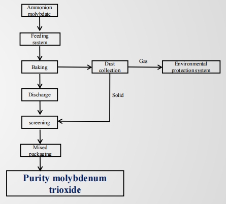 ◆ Purity molybdenum trioxide production process, using high temperature baking method, the product has the characteristics of large pine ratio, good fluidity, high purity, good solubility and so on.