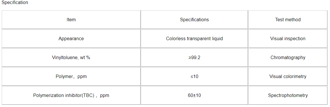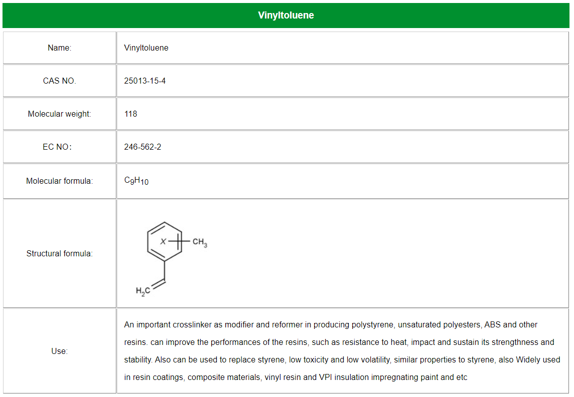 An important crosslinker as modifier and reformer in producing polystyrene, unsaturated polyesters, ABS and other resins. can improve the performances of the resins, such as resistance to heat, impact and sustain its strengthness and stability. Also can be used to replace styrene, low toxicity and low volatility, similar properties to styrene, also Widely used in resin coatings, composite materials, vinyl resin and VPI insulation impregnating paint and etc
