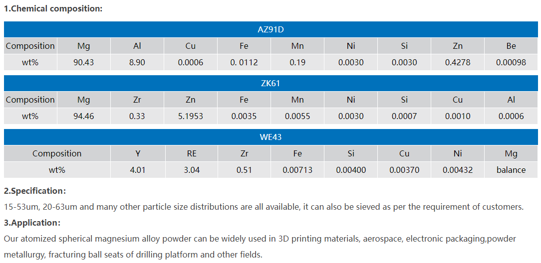 To meet the current market demand and adapt to the development of science and technology,by using our own patented technology and protecting under the inert gas, we produced a new product-atomized spherical magnesium alloy powder which is characterized by low oxygen, low nitrogen and spherical powder. It includes AZ91D, ZK61, ZK60, AZ31, WE43 and other brands, we can also customize various types of magnesium alloy powder according to the customer’s requirements.