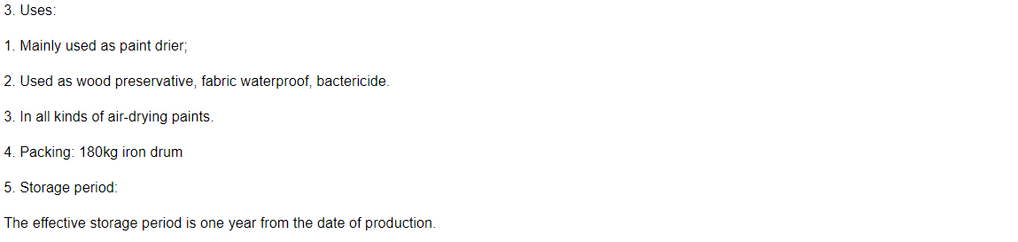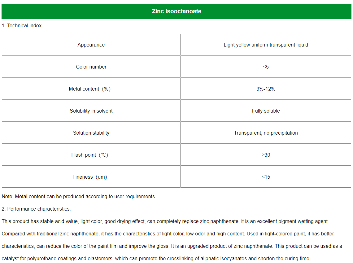 Zinc isooctanoate is a kind of assistant drier, which can completely dry the paint film, so it has better hardness, and has the characteristics of stable acid value and molecular weight, excellent storage stability, light color, small odor and high content. Zinc isooctanoate is suitable for white or light color paint, which can reduce the color of paint film and improve luster. It is an upgraded product of zinc naphthenate.