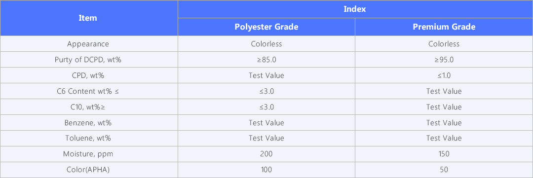 DCPD can be used as basic material of organic products such as: ferrocene, adamantane, nobornene, cyclopentene, cyclopentane, cyclopentanol, cyclopentanone, cyclopentane halide, glutaraldehyde and etc. This product also can be prepared to produce Hydrocarbonresin, unsaturated polyesrer resin and etc.
