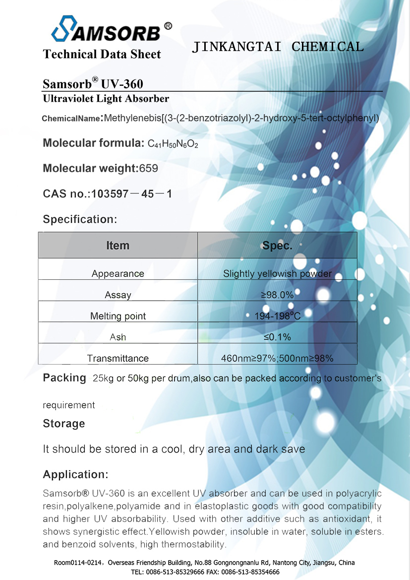 UV-360 is a highly effective UV absorber, which can absorb 300-400nm UV and is widely compatible with a variety of resins. It has very low volatility and can be used with other light stabilizers or antioxidants. It is suitable for acrylic ester, polyester, polycarbonate, polyoxymethylene, polyamide, polyolefin, styrene polymers, elastomers, adhesives, etc. it can be formed by powder, solution or melt extrusion, which can prevent crystallization seepage and sublimation. It can also be used for casting and thin layer construction of fiber, rubber, etc Paper and wallpaper, etc.