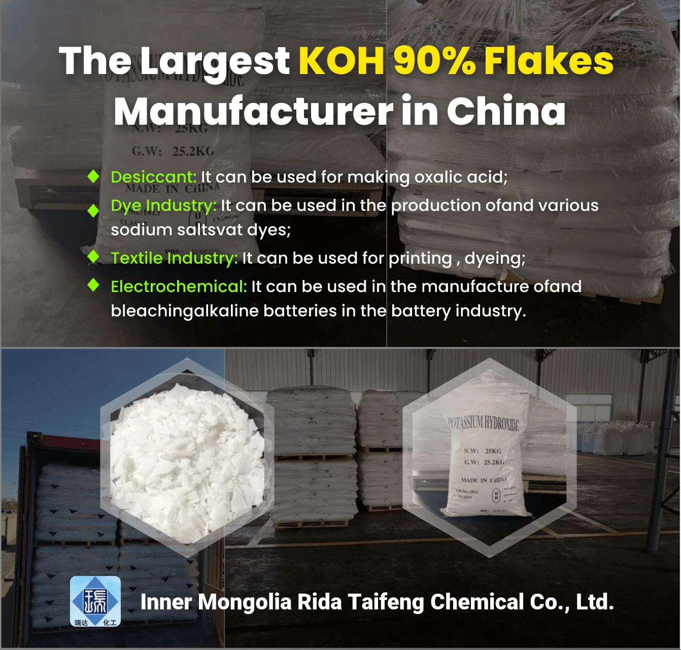 ● Potassium Hydroxide functions primarily as an analytical reagent, saponification agent, desiccant, plating agent, and in dyeing and synthetic fiber production.